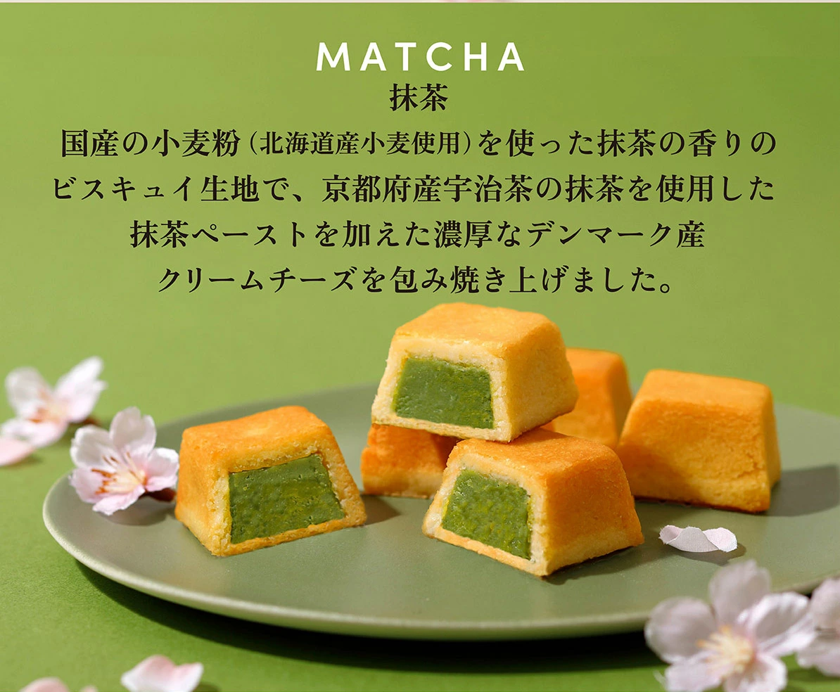 国産小麦(北海道産)を使用した抹茶の香りのビスキュイ生地で、京都府産宇治茶の抹茶ペーストを加えた濃厚なデンマーク産クリームチーズを包み込み、風味豊かに仕上げました。